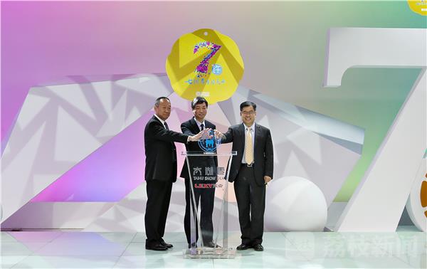 从左至右:江苏省商务厅副巡视员郁冰滢、江苏出入境检验检疫局副巡视员刁彩华、江苏省广播电视总台副台长、好享购物股份有限公司董事长徐敢峰共同点亮“三同”标志