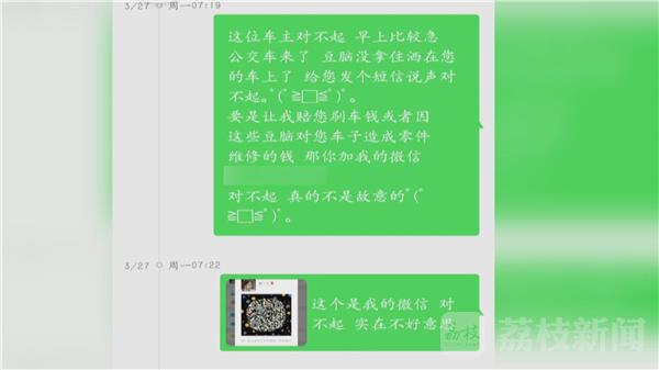 3月27号早上刚起床,徐州市民刘女士就遇到了一件添堵的事儿,不过,后来,正是这件事儿,又让她温暖了一整天?究竟怎么回事呢?这还得从刘女士收到的一条陌生短信说起:“这位车主对不起,早上比较急,公交车来了,豆脑没拿住,洒在您的车上了,给您发个短信说声对不起,要是让我赔您刷车的钱或者维修的钱,请加我微信。” 3月27号一大早,徐州市民刘女士就收到了这样一条短信。