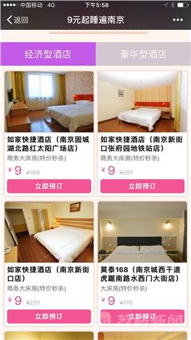 不久前,在线旅游平台携程开启了“9元住遍全国”项目,并将南京放在了第一站。也就是说,只要抢到,9元可以入住经济型酒店、199元可以入住五星级酒店,涉及到南京近600家酒店。
