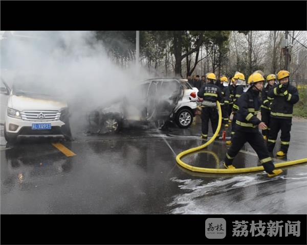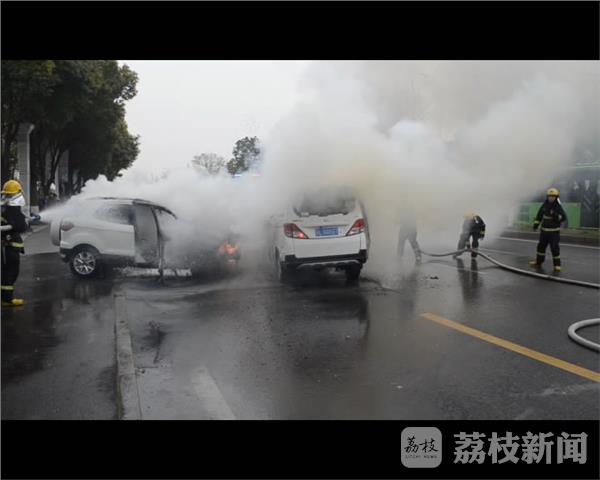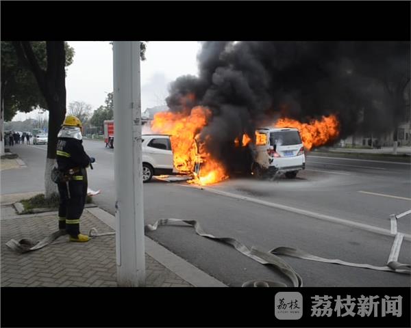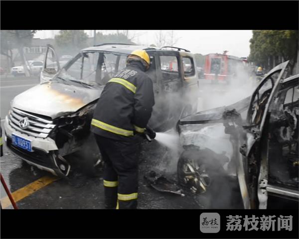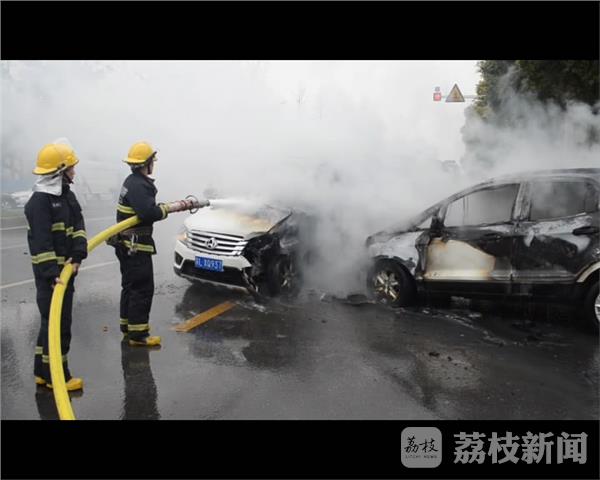 3月30日上午11时27分,镇江丹阳市开发区迎宾路附近,两车相撞引发大火,消防官兵迅速赶赴现场救援,所幸无人员伤亡。