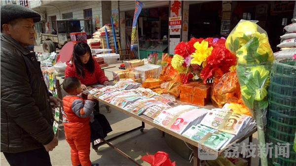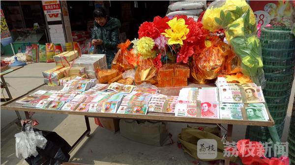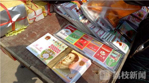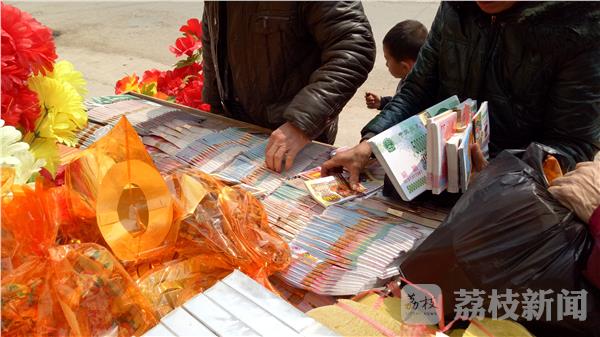 在乡镇街头溜达一大圈,发现这里许多摊点在售卖祭祀用品,花花绿绿的装饰成亮眼的风景。除了传统的祭祀用品外,“大款钞票”纷纷“登场”,成为市民选购清明节祭祀的主角,有香烟、汽车、尤其显眼的就是大额钞票。
