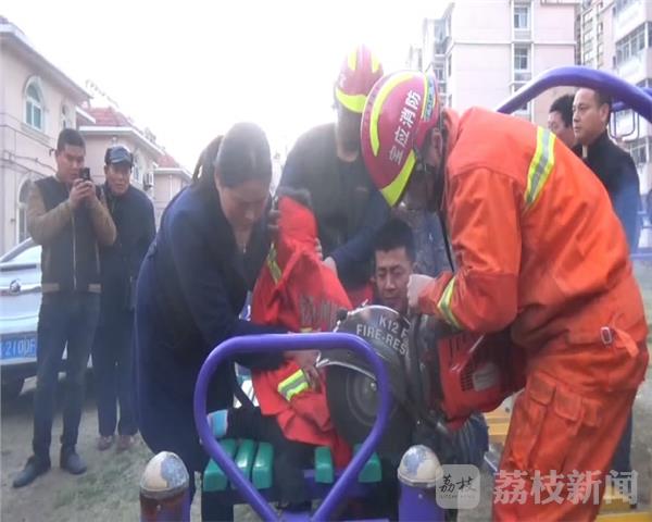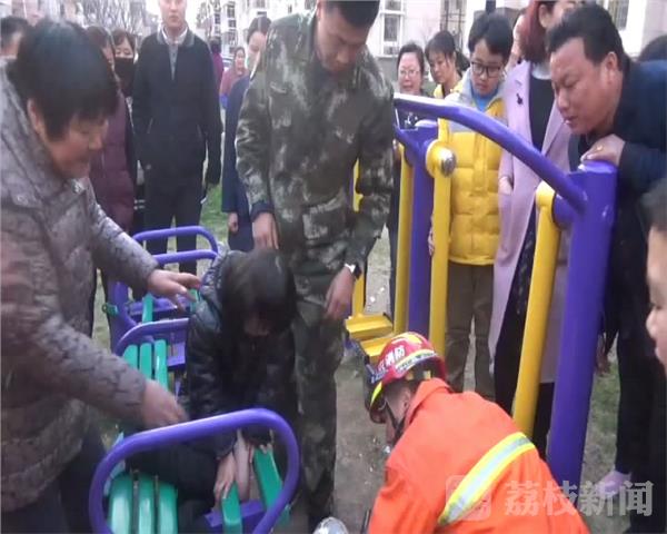 昨天(3月31日)傍晚6点左右,扬州市宝应县苏中南路一小区内,一名6岁女童在健身器材上玩耍时,左腿不慎卡进器材栏杆夹缝中无法取出,当地消防部门接警后迅速赶往现场救援。
