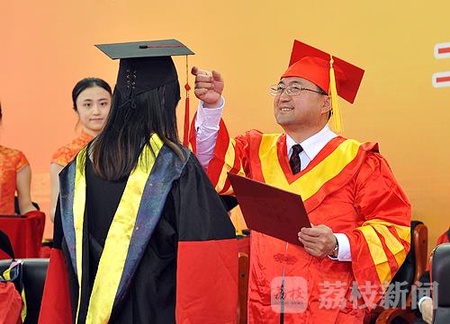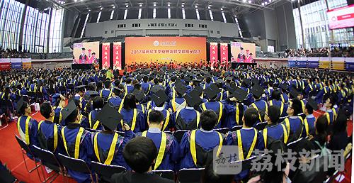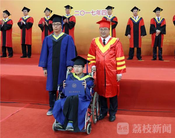 在南理工体育中心,两千多名硕士毕业生从老师们手中接过毕业证书,接受老师的拨穗。最后上场的是14级3班学生张雨涵,坐在轮椅上的他保持着灿烂的笑容。7岁患脊椎肿瘤,在上海治疗时被误诊,导致下半身截瘫。大学后,他就独自在学校附近租房子生活。