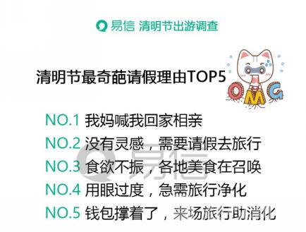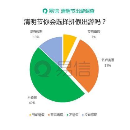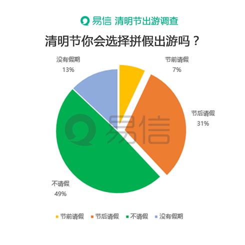据易信不完全网络调查显示,这次清明小长假拼出8天假的人群占接受调查人数的38%,有7%的网友表示希望错峰出行选择节前请假,31%选择节后请假。