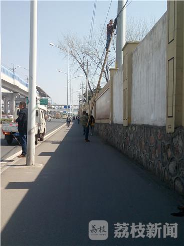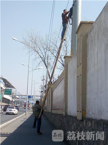 昨天(4月2日)上午,在南京江北大道葛塘长途汽车站附近,两个工人师傅在高空作业整理电缆线时候,一个在上面工作,一个在下面把工作用的梯子抱在面前,看上去真的很危险,这里来往人员频繁,万一有什么闪失不但伤到自己,还有可能伤及路人。笔者认为工作不容易,但是也不能拼命工作而忽视安全,这样一旦出了事故后果不堪设想,希望大家提高安全生产意识,有关企业更要加强对员工的安全思想教育,杜绝违章作业。