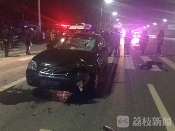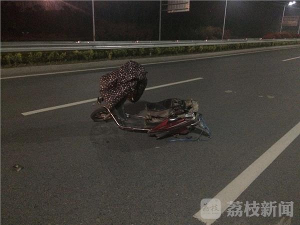 现场停放的一辆苏L牌照的黑色轿车,前挡风玻璃破了一个洞,汽车左前侧大灯周围破损严重,保险杠脱落,在不远处停放一辆电动车,严重损坏。记者看到,从撞击处到电动车被甩出去的20米距离内,散落着一些轿车和电动车的零部件。