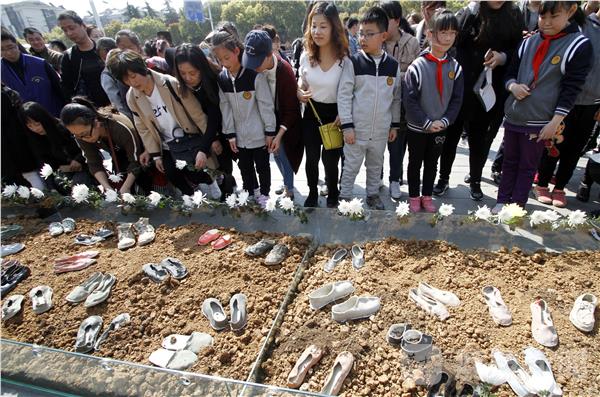 南京小学生和前来吊唁的参观者们,将一枝枝黄色、白色的菊花依次摆放在展柜四周,告慰遇难同胞。