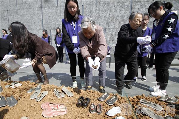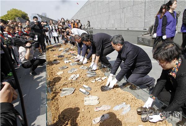 南京大屠杀幸存者等代表将从17个南京大屠杀遇难同胞丛葬地取出的泥土,洒在这些色彩、形态、大小不一的陶瓷鞋上。这些沙土是3月28日由一群来自东南大学成贤学院的志愿者采集,从曾经浸染着遇难者鲜血的苦难之地采集沙土,承载着后人对遇难同胞深沉的悼念与哀思。
