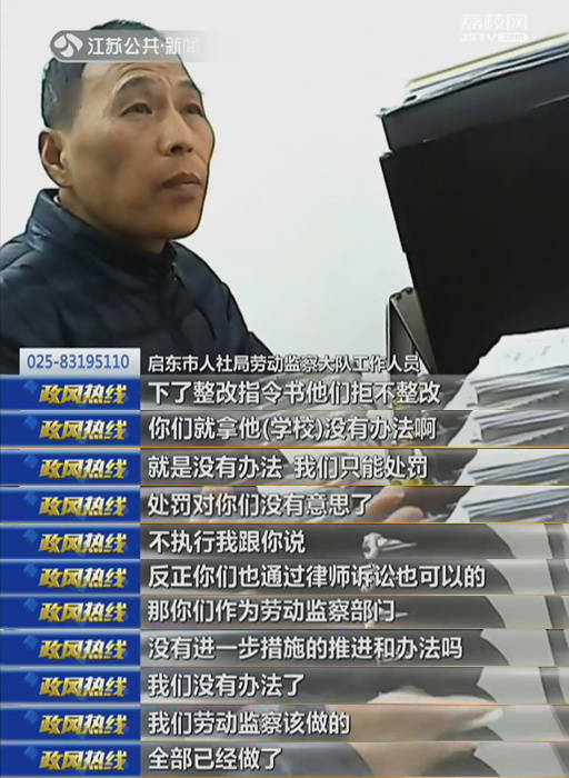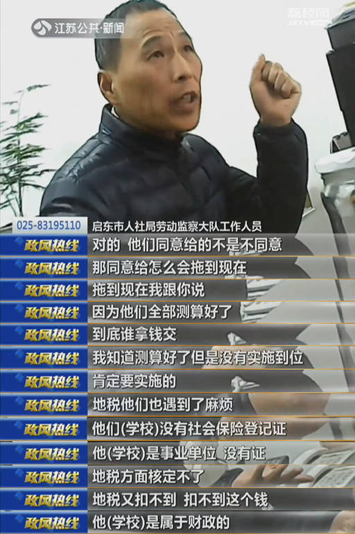 无奈之下,记者只好陪同工人代表来到了启东市人社局劳动监察大队。相关工作人员表示:学校方面拒不缴纳,他们也没有办法