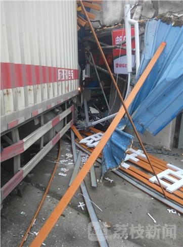 记者在现场看到,肇事的是一辆苏州牌照的白色箱式货车,车头已经“死死”地卡在商店内,造成商店部分墙体垮塌,现场一片狼藉。而在路边躺着两位伤者,不停地痛苦呻吟着,地上有血迹,驾驶员也有受伤。记者看到,路灯杆、站牌杆硬生生被撞瘪、撞断,一块标有地名的石碑也被连根“拔”起。记者目测了一下,从撞人处到把两位老人“甩”出去,足足有15米远。