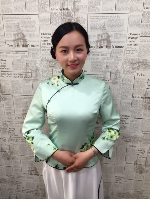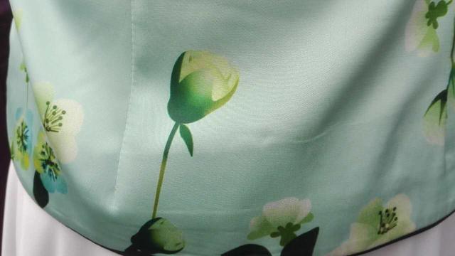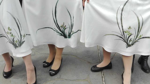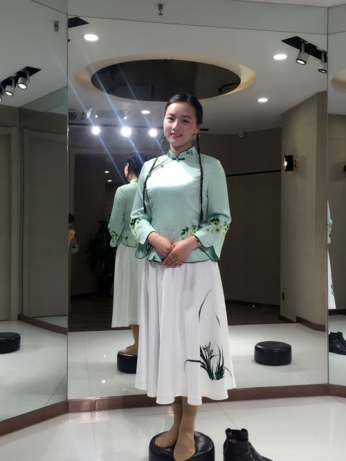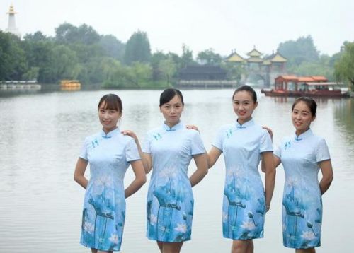 今年瘦西湖的导游服为传统中式式样,典雅大气。整套服饰采用蚕丝缎面料,运用缎面数码印花技术,上衣以湖绿色为主基调,在领口、右肩及袖口位置均绘制了扬州市花琼花的图案,展现出瘦西湖导游们所特有的古典优雅范儿。下身着白色过膝长裙,裙摆上的兰花图案,全部为扬州著名国画大师张宽手绘,每个人身上的花朵都不尽相同。