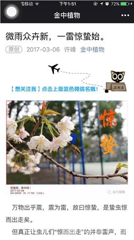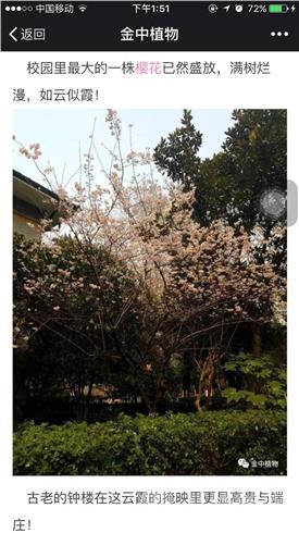 微信走进我们生活,微信公众号也成为很多人获取信息的途径之一。在南京金陵中学,有位生物老师开了一个微信公众号,专门介绍校园里的花花草草和它们背后的故事。