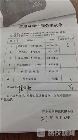 “当事人补领结婚证时,他拍照28块钱,材料复印费3块钱。我们婚姻登记工本费登记处是不收的,但是照像、复印是社会化服务,是自愿选择的,当事人也在确认单上签了字。”