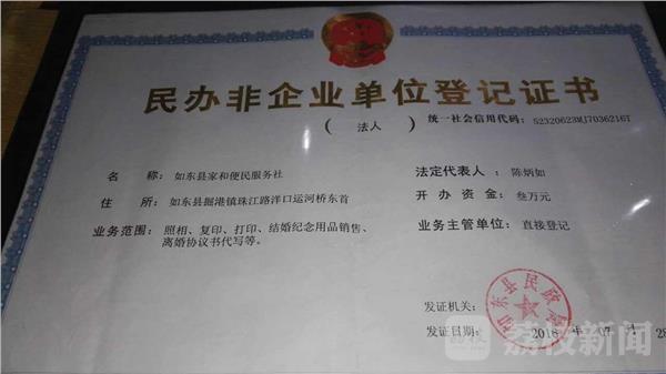 记者看到这家“如东家和便民服务社”营业执照上性质为“民办非企业法人”,意味着是非营利性质。省民政厅社会事务处蔡健说,婚姻登记处是民政局下属的事业单位,与社会化服务机构应该“四分开”。