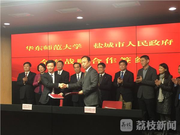 4月13日下午,盐城市人民政府与华东师范大学在上海签订全面战略合作协议。合作内容有六项:一是开展合作办学,二是提供人才资源建设支持,三是建设华东师范大学盐城教师培训基地,四是开展教育科研成果推广工作,五是开展实习基地项目建设,六是开展教育信息化领域合作。同时,双方将在盐城市城南合办盐城实验中学。