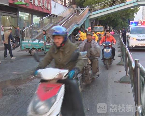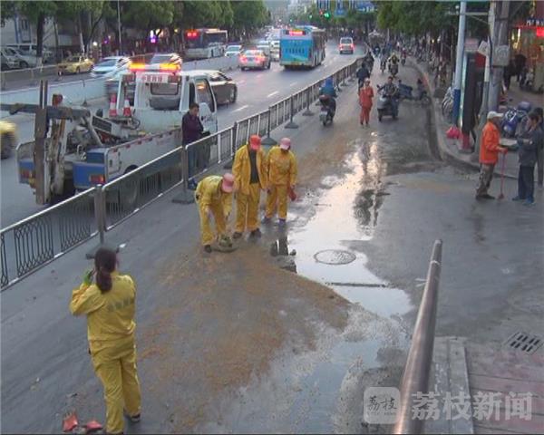 (4月12日)昨天傍晚六点钟,市政工人在建宁路64号附近清理堵塞的下水道时,发生油污漫溢到主干道上,多人摔倒。