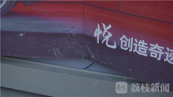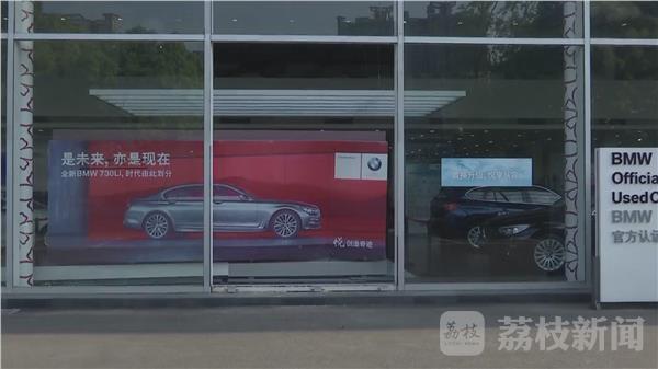 从李先生给记者提供的现场照片上看,这辆苏D牌照的海马汽车,汽车尾部撞进了4S店内,车卡在了当中,这扇玻璃被撞毁,4S店内的这块展板也受到撞击后倒塌,又恰巧压在了一辆宝马7系的展车上。