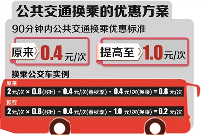 晨报讯(交汇点·南京晨报记者 盛文虎)南京市民又有福利了!记者昨日从南京市物价局获悉,8月1日起,南京将进一步加大公共交通换乘的优惠力度,90分钟内公共交通换乘优惠标准由原来的0.4元/次,提高至1.0元/次,新政策实施后,春秋季换乘公交车只需要0.2元/次。