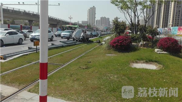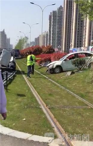 4月14日下午2点左右,淮安市翔宇大道上两辆机动车发生严重相撞,导致其中一辆白色轿车被撞进有轨电车轨道上,事故造成有轨电车被逼停下。