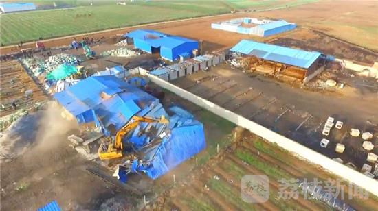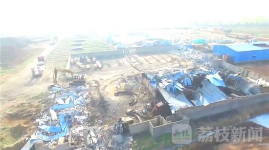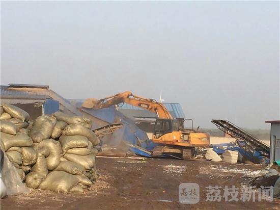4月13日,东海县委、县政府连夜部署。4月14日清晨六点,东海县、双店镇政府的主要负责人会同县公安、环保、供电、工商、质监、卫计委等十多个部门的数十名执法人员一同来到双店镇,对北涧水库旁这六家非法小作坊展开联合执法行动,十多台推土机、挖掘机同时进场作业,对现有厂房及生产设备进行拆除,同时当地警方也依法对厂区内阻挠执法的人员进行了拘留。