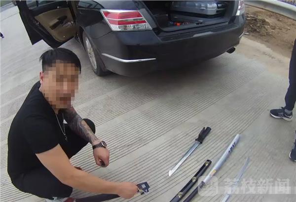 当天中午,民警在对这辆苏州牌照的本田轿车例行检查,发现车辆后牌没有按规定进行安装,而且车上三名男子均有纹身。民警让其下车接受检查,在其车辆后背厢内发现了多把近1米长的砍刀。