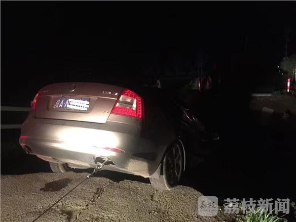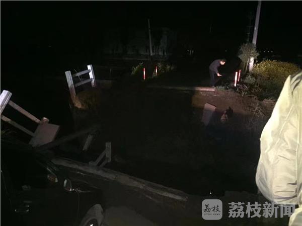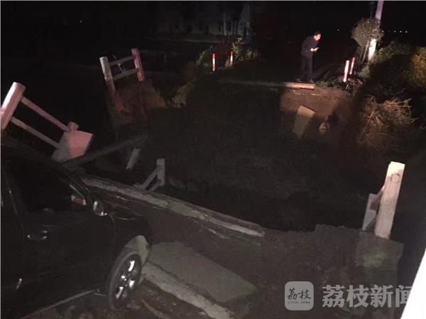 4月9日夜间,扬州甘垛镇发生一起交通事故,一辆轿车行驶至桥头处,桥突然断裂,导致轿车悬挂在桥头。所幸驾驶人速度比较慢,车上驾驶人及两名乘员未受伤。