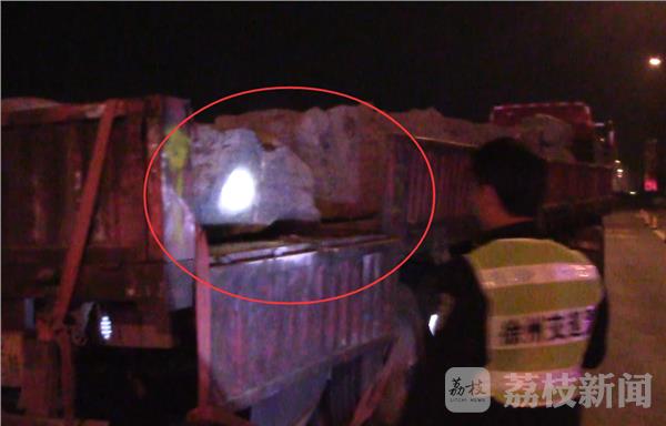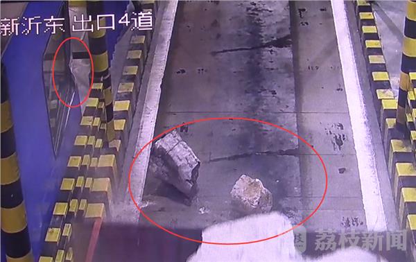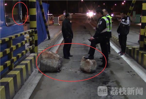 4月15日晚上10点,一辆大货车在驶出京沪高速新沂东收费站时,突然发出巨响,执勤的徐州高速七大队民警过去查看发现,货车驶过的收费道口留下两块大石头,收费岗亭的玻璃也被石头砸坏。