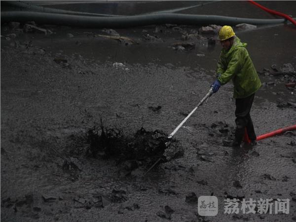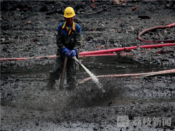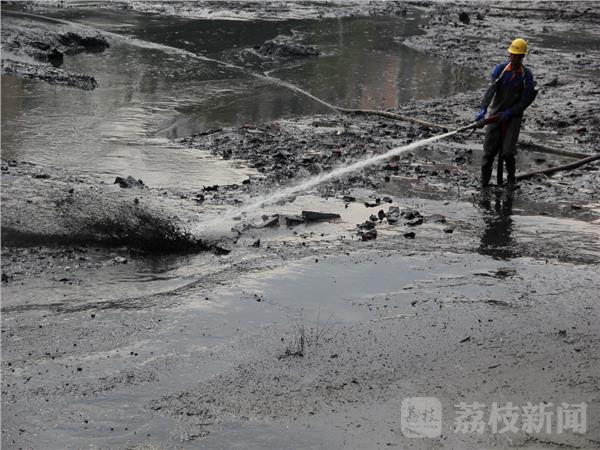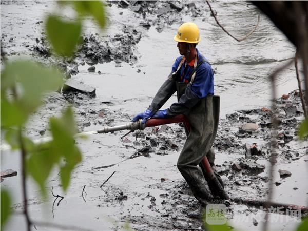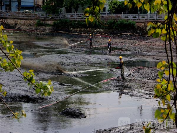 4月16日上午,在南京鼓楼区新民门金川河岸上,不少外出的市民看见工人们正在冲洗河道淤泥,乌黑的淤泥和黑臭的水包裹着他们,工人们站在这样环境中,一干就几个小时,而且黑臭水不时喷上一脸,但工人们没有一点怨言。他们的工作将使市民家门口的黑臭河变身休息游玩的好去处,这样的敬业让不少市民竖起了大拇指,城市的建设少不了他们的贡献,让我们给他们点赞。