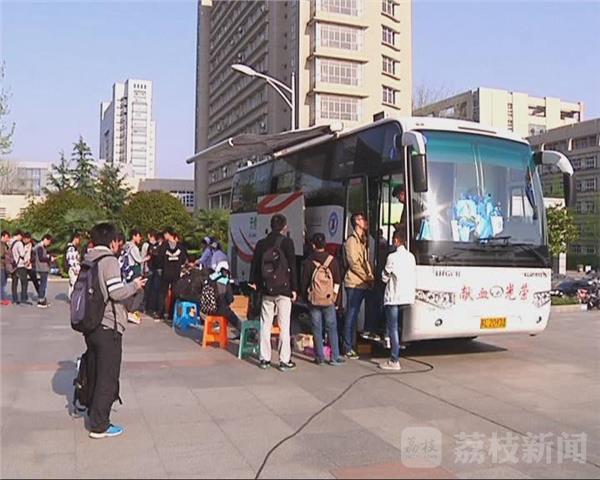 4月15日在江苏大学材料学院门口,一辆采血车下已经排着二十几位排队验血的大学生,而在车厢里,几位大学生准备就绪,挽起袖子,体内的鲜血正缓缓流进采血袋。