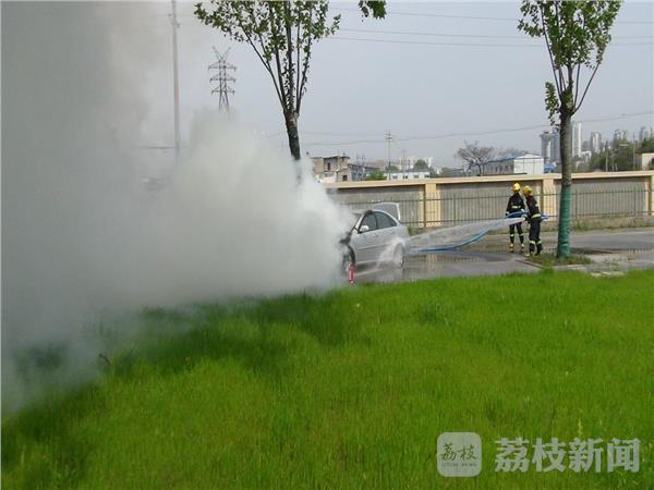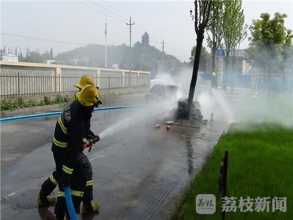 4月17日下午2点20分在南京鼓楼区江边路一辆轿车避让车辆撞大树后燃烧,司机李师傳用灭火机扑救不起作用。随后, 司机报警,119赶到后15分钟迅速扑灭大火。目前,具体原因正在调查处理。