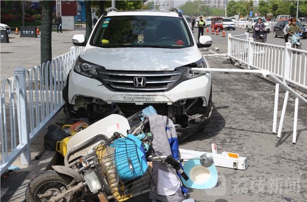 肇事车上的行车记录仪显示,当时韩某驾车行驶至中山北路与二环北路附近,车辆突然跑偏,冲向了非机动车道的隔离护栏,在撞坏六节护栏之后,车辆又将两名骑电动车的市民撞倒。正在附近巡逻的鼓楼交警发现后,立即上前查看情况。