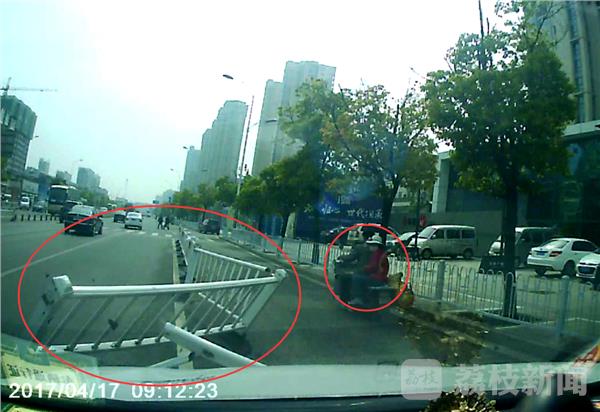 4月17日上午,徐州的一名驾驶员韩某,因疲劳驾驶在开车途中打了盹,撞坏了六节护栏后,又撞伤了两名骑电动车的行人。这惊险的一幕,被这辆肇事车的行车记录仪清楚的记录下来。