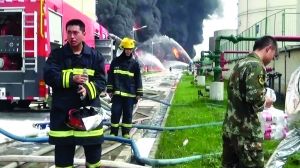 在靖江灭火救援时,王克巍流鼻血仍坚守在第一线 扬州消防供图