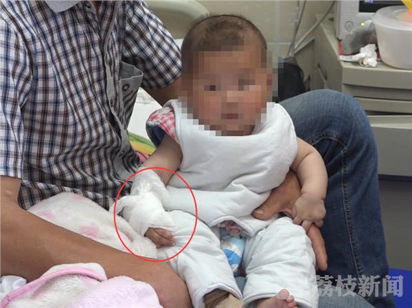 躺在爸爸怀里的女婴叫涵涵,刚满5个月,前两天涵涵的母亲发现她不停的哭闹,但一直也没找到原因。直到前天晚上,涵涵的妈妈帮她换衣服时才发现涵涵的手指肿的厉害,手指上还缠了根发丝。