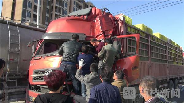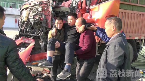 后面一辆大货车驾驶员被卡在驾驶室里,有几位路过的村民听说要帮忙救人,都主动的上来帮忙用撬杆把变形的驾驶室往外撬,争取让变形的驾驶室空间增大,经过大家十几分钟的努力把被困的大货车驾驶员救了出来,抬到路边等待120医生救援,“正好路过的大丰区三龙丰余村民陈杰和新团村三组的郭大宏说,我刚到这里看到他们要帮忙,我就上去帮忙了帮他撬驾驶室,然就把人抬到这里来了”。