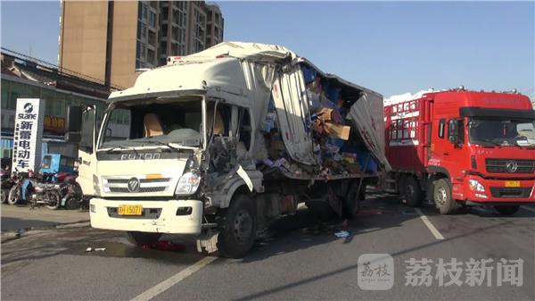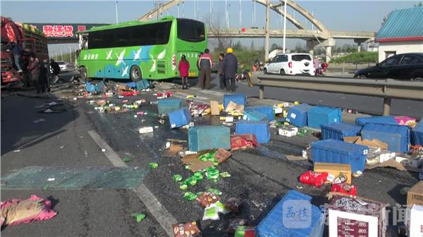 事故现场造成双向的车辆缓慢通行,地上到处是相撞时撒落一地的物品,交警在现场勘查和指挥交通,具体事故原因和赔偿还有待警方进一步调查,目前,交通己恢复正常。