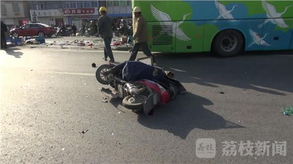 现场大客车骑在路中间的护栏上,电动车倒在路中间,电动车骑手趴在电动车上,一动不动,大客车前左侧被撞了坏,挡风玻璃也被撞碎,驾驶员倒在车上双脚被卡不能动弹,车上旅客被