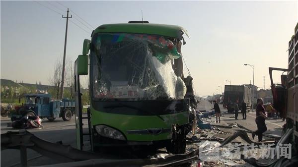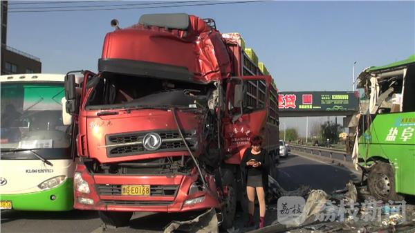4月19日上午,S332省道盐城市大丰区新团高架东侧发生一起严重的交通事故,一辆大客车为了避让一辆横穿马路的电动车,冲过路中间的护栏撞上对面正常行驶的大货车,事故发生后造成电动车驾驶员、大客车驾驶员、一辆大货车驾驶员三个受伤,路过的村民听到响声后,纷纷主动的帮助营救被困驾驶员。