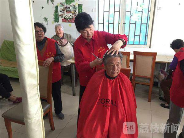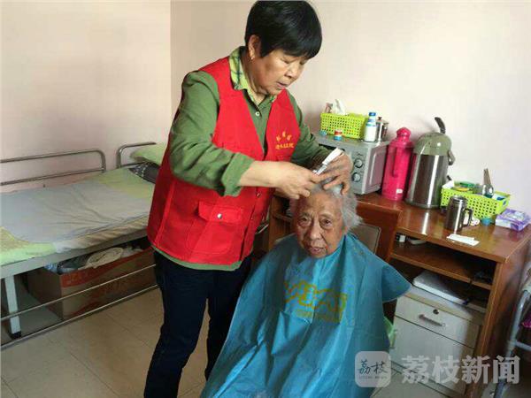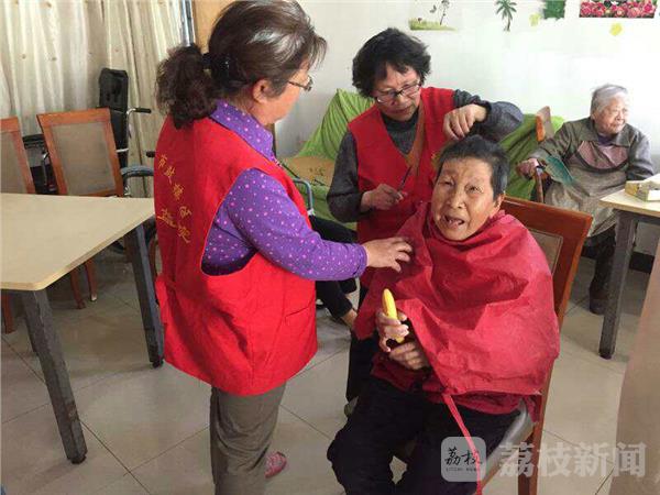 4月19日下午,钟阜路社区支部书记王春香带领慈善义工来到银杏树养老院,为老人们免费理发。义工们带着各自的理发工具,穿上志愿者马甲,走进养老院。遇到行动不便、瘫痪的老人,义工们就用双手全程将老人托着,小心地为她理发。