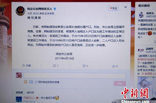 中国新闻网消息,19日晚,河北省保定市公安局官方微博通报称,针对日前有网帖提到“安新县公安局长违规办理户口”等信息,经调查,李某、杨某两人户口为因工作调动正常迁入。其他户口迁入是否违规,正在进一步核查。