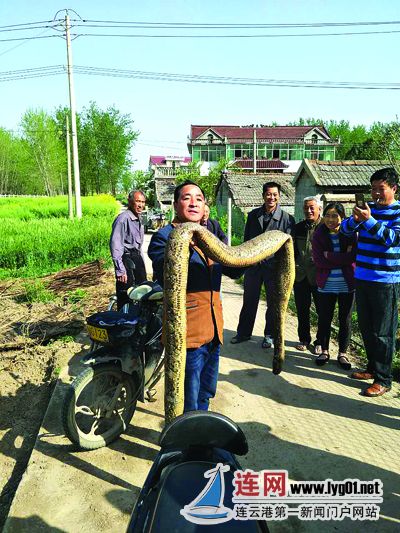 4月19日上午,灌南田楼的一位居民向本报热线反映,有人在田楼镇三庄村的一条河里发现大蛇。据当地村民王先生介绍,当天上午村民正从河里抽水灌溉,突然发现了这条大蛇。“当时还以为是一根粗树枝,但走近一看其表面有花纹,竟然是一条大蛇。”
