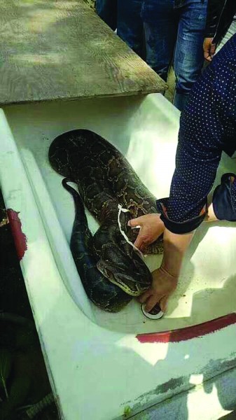大蛇打捞上岸后被放到了一个池子里,随后有人拨打了110。当地派出所民警立即赶到现场,经过检查确认大蛇已经死亡。“我从来没看过这么大的蛇,应该算得上蛇王了!”刘先生说。