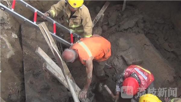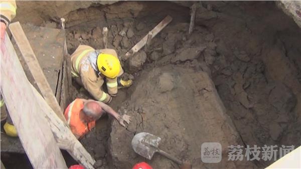 4月19日下午三点钟左右,泰州靖江市公安局附近一处管道施工现场,发生塌方事故,两名工人被埋。接到报警后,当地消防人员立即前往救援。 消防员赶到现场后发现,这两名工人的下半身全陷在泥土里,好在两人身体状况还好。救援人员利用铁锨轻轻挖掘,十多分钟后,两人被消防员抱出,利用梯子,两名工人被救了出去。据了解,被困两人当时正在施工,突然,靠近道路的一侧泥土发生大面积塌方,两人没得来及反应,腰部以下被塌方的泥土掩埋。好在消防员救援及时,两人只受到轻伤,目前,事故原因还在进一步调查中。
