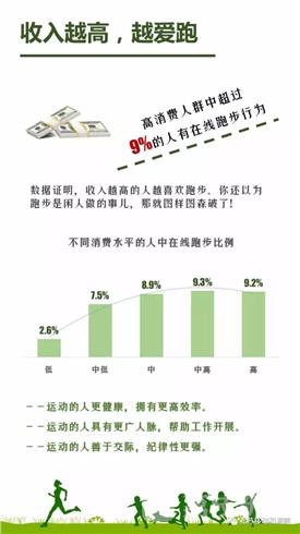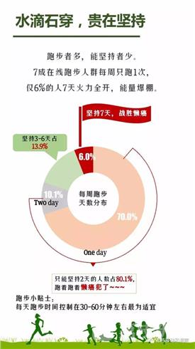 从消费习惯分析看,在这些爱跑步的市民当中,高消费高收入人群中超过9%的人都有在线跑步行为;工作日跑步人群远多于周末跑步人群。不过,跑步的人多,能够长期坚持的却不多,看来“懒癌”是全省人民的通病。帅敏:7成在线跑步人群每周只跑一次,仅6%的人一周7天火力全开,一周只能坚持两天的人数占到80.1%。不过我们也提醒大家,每天跑步时间控制在30-60分钟最好,小心伤了膝盖。另外,江苏人更喜欢下班之后穿上跑鞋去“黄昏跑”,传统的“晨跑”并没有想象中受欢迎。虽然任何时候跑步都没所谓,但也建议想要减肥的小伙伴们尽量选择晨跑,因为理论上早上跑步没有足够糖源补充,它能够调动更多脂肪给身体功能,从而达到减肥的效果。