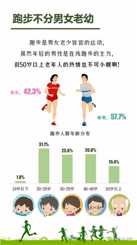 江苏移动大数据显示,在3月份全省在线运动类APP排名中,最受欢迎的前10个APP全部是跑步类APP,看来江苏人运动热情高涨。尽管跑步是男女老少皆宜的运动,但从跑步人群和年龄分布来看,差异化比较明显。其中,男性比女性更热爱跑步,占比为57.7%和42.3%;而20-29岁年龄段的青年人群最热爱跑步,占比达31.1%,其次是40-49岁的中年人,占比达到26%,而50岁以上的叔叔阿姨,占比也高达15.4%。值得注意的是,我省青少年群体“动起来”的不多,19岁以下的占比仅达1.8%。