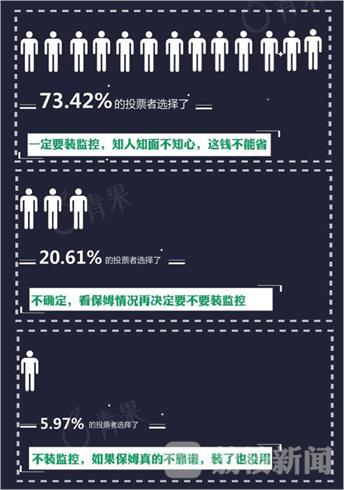 社会上每一起虐童事件的出现,都会引发家长对孩子安全保障的担心,尤其是双职工家庭对“保姆带孩子”的不信任加剧。据移动社交APP易信旗下青果摄像机在网络展开的一项关于“请保姆后是否安装监控”的调查显示,超七成网友表示请保姆后一定要安装监控,希望通过加强监控约束保姆行为。 据易信青果网络调查显示,73.42%的网友认为请保姆后,一定要安装监控,20.61%表示需要看保姆情况再决定,仅有5.97%表示不装监控。 刘女士在调查中留言表示,“保姆毕竟是外人,防人之心不可无,而且新闻上报道的那些关于保姆虐待婴儿,殴打老人的事件,都是被监控拍到后雇主才知情的。”