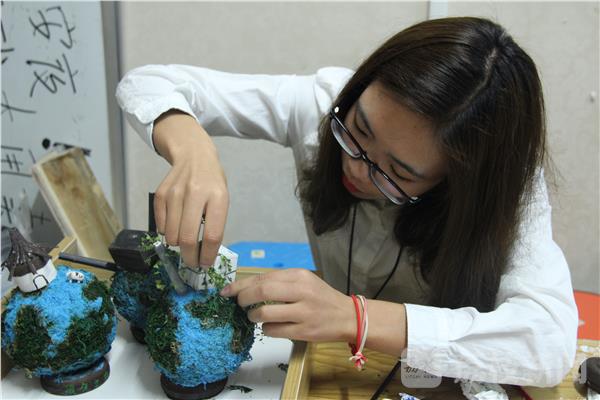 “我们做的这三个地球是按不同的时间段划分的,分别代表过去的农业时代,现在的工业时代和我们的未来,农业时代我们通过简陋的小房子,牲畜,绿色的大陆来体现,工业时代则是用工厂,烟囱土灰的大陆来表达。未来主题的地球与工业时代的有很大的相似,因为它代表不久的将来。我们希望绿色生产和节能生活能越来越普及,所以用简单的白色表现更高效率,更少污染的工业,用附在建筑上的植物花草来诠释将绿色环保理念融入生活生产中,逐渐变绿的大陆来体现我们的改变。这是我们对未来的一份期望,我觉得今年地球日的主题特别好,我们既是这故事的见证者,书写者,又会成为它的讲述者。我们要回首过去,做好当下,憧憬未来。”谈及地球的三个故事,夏庆月讲述道。行动挑战想法,直面困难不言弃“我的想法很简单,但没想到实施起来却这么困难。”制作者夏庆月想起一周前的制作过程坦言道。“之前我做过的微缩盆景都是平面上的,而在球面上种植与制作是头一回,着实增加了不小的难度。首先固定泥土就难住了我们:泥土比较软滑,也有一定分量,塑形成球时会产生形变,而且极易掉落。我们最终用缝纫线包裹内部泥土才得以将其制作成现在的球体,包裹中,线也断裂了很多次,每次断裂都意味着重新来过。每一个地球我们都至少包裹三层线,以保证稳定性。由于我是女生,力气有限,很难将泥土按实,我还找了同专业的男同学帮忙。在小建筑制作方面,材料也比较难选择和处理,于是我们花了一周的时间从食堂,超市,教室等地方收集制作材料,多次处理才得到了这三件装饰,真的很不容易。”小小植物地球,大大环保意义据记者了解到,学院的同学们表示都很喜欢这件作品。