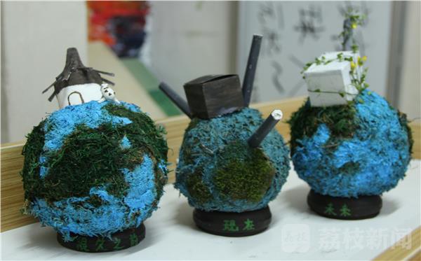 “我们制作‘地球’的主要材料是苔藓、水苔和一些废旧物品。苔藓是从学校空地上采摘过来的,通过控制培养条件得到不同颜色的苔藓,再把这些苔藓种植在做好的“土球”上象征陆地, 水苔则是涂上蓝色代表地球上的江河湖海。用这些植物做出的地球能很好的体现她真实的样貌,我又是园艺与植物保护学院的,自身比较擅长植物的培养与景观的制作。于是就有了这件作品。”三个地球,三个故事,一份回忆,一份思考,一份憧憬记者仔细观察了这三个地球,虽然用的材料一样,但却体现出不同的风貌。植物地球的底座上分别印着“很久以前”、“现在”、“未来”这几个字。在它们的顶部还有一些小建筑作为装饰。