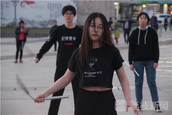 2017年4月22日晚上6:40分,江苏省淮安市大运河文化广场上正在上演高校女生双截棍快闪,现场十几名在校大学生们用一场舞蹈和双截棍快闪呼吁市民远离低头族。