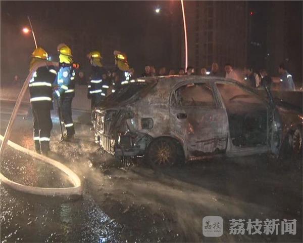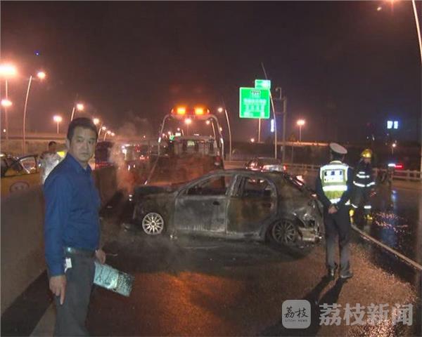记者赶到时,火已经被消防队员扑灭,肇事车辆已经烧成空壳,从市民拍摄的图片来看,当时的火还是很大的。目击者透露,肇事车是一辆白色轿车,由西向东行驶撞到高架水泥墩后,飞出20多米远横在桥面上。司机自己爬出来后,弃车离开现场。这时车子还没起火,但在他走后不久,车子便着起火来。这位目击者表示,如果司机当时不走,发现起火后及时扑救,车子或许就不会报废了。凌晨3点左右,交警找来清障车把事故车辆拖走,交通恢复畅通。